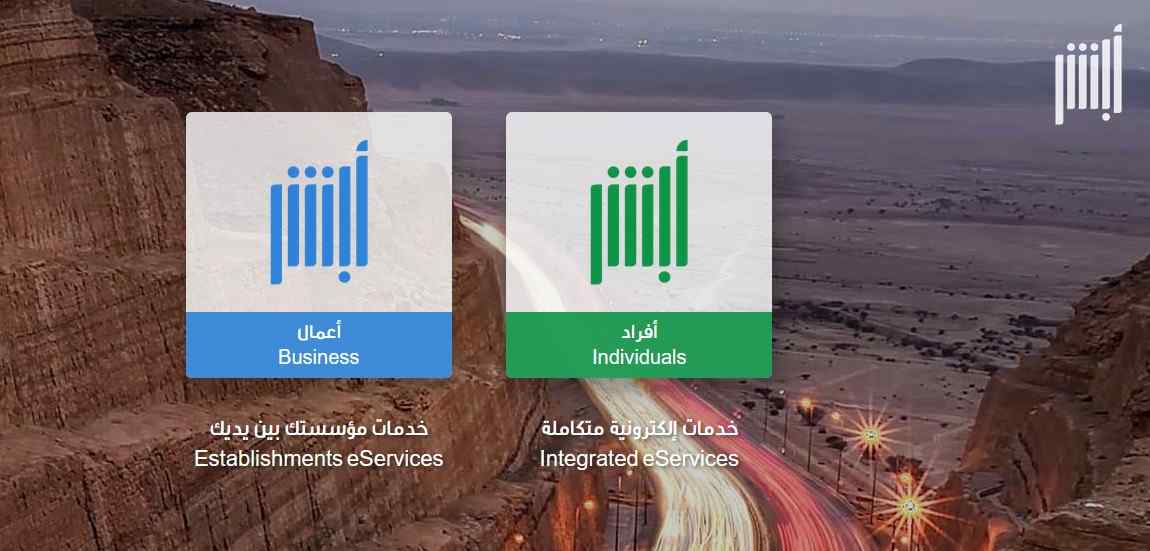 بداية يقوم المستخدم بالولوج إلى المنصة الإلكترونية أبشر المتاحة على شبكة الانترنت بشكل مباشر من هنا.