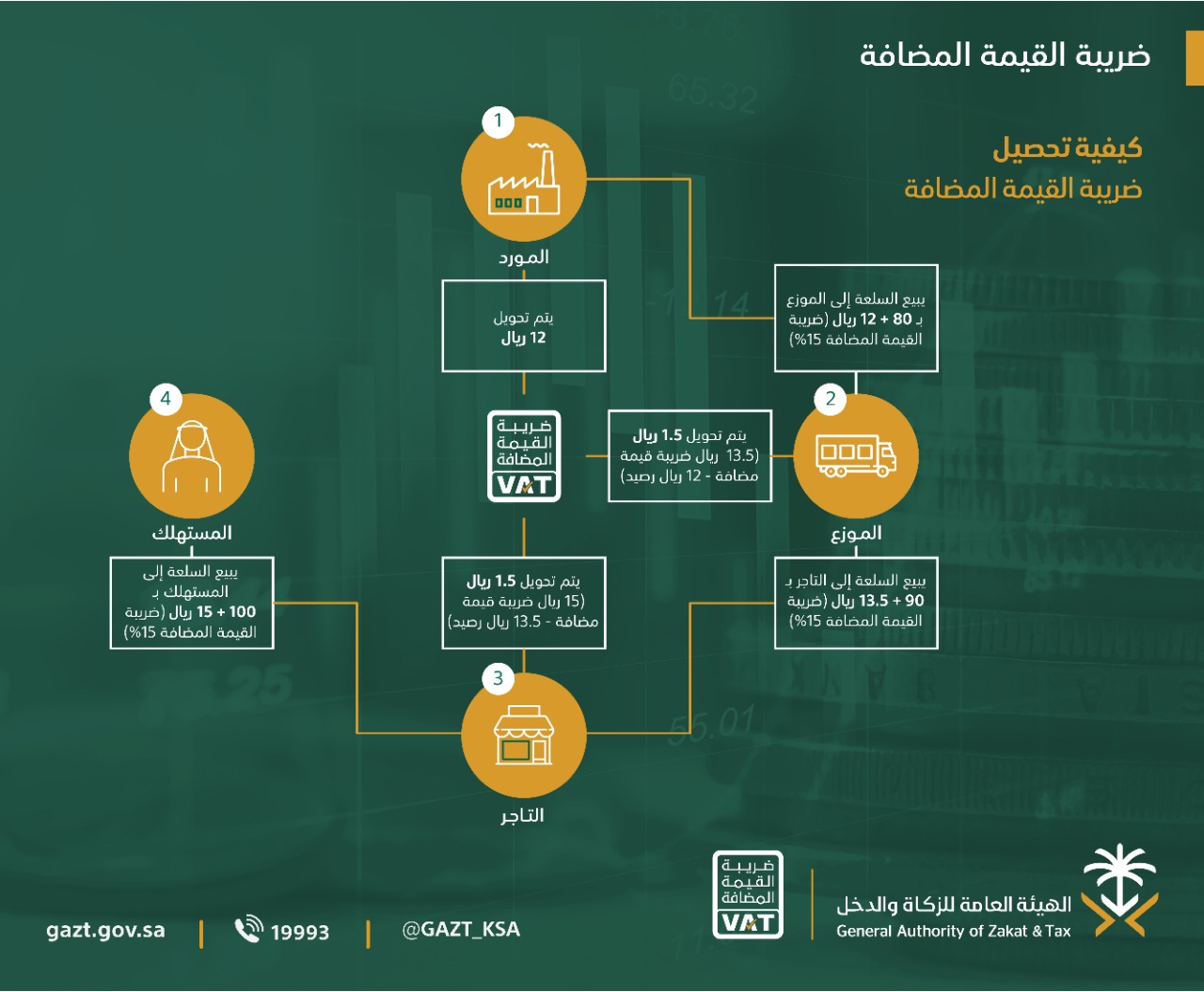 بحسب ما تم الإعلان عنه من قبل الهيئة العامة للزكاة والدخل، أنه يتم فرضها في جميع مراحل الإمداد، بدايةً من الإنتاج، مرورًا بالتوزيع، ومرحلة البيع النهائي سواء أكان للسلعة أو الخدمة طكزسز بناء على ما تم الاعلان عنه رسميا من الجهات المختصة :