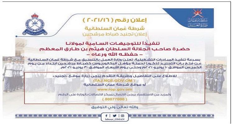 أعلنت وزارة العمل العمانية بالتنسيق مع شرطة عمان السلطانية عن توفير الفرص للتوظيف لحملة بكالوريوس الطب والهندسة والطيران.