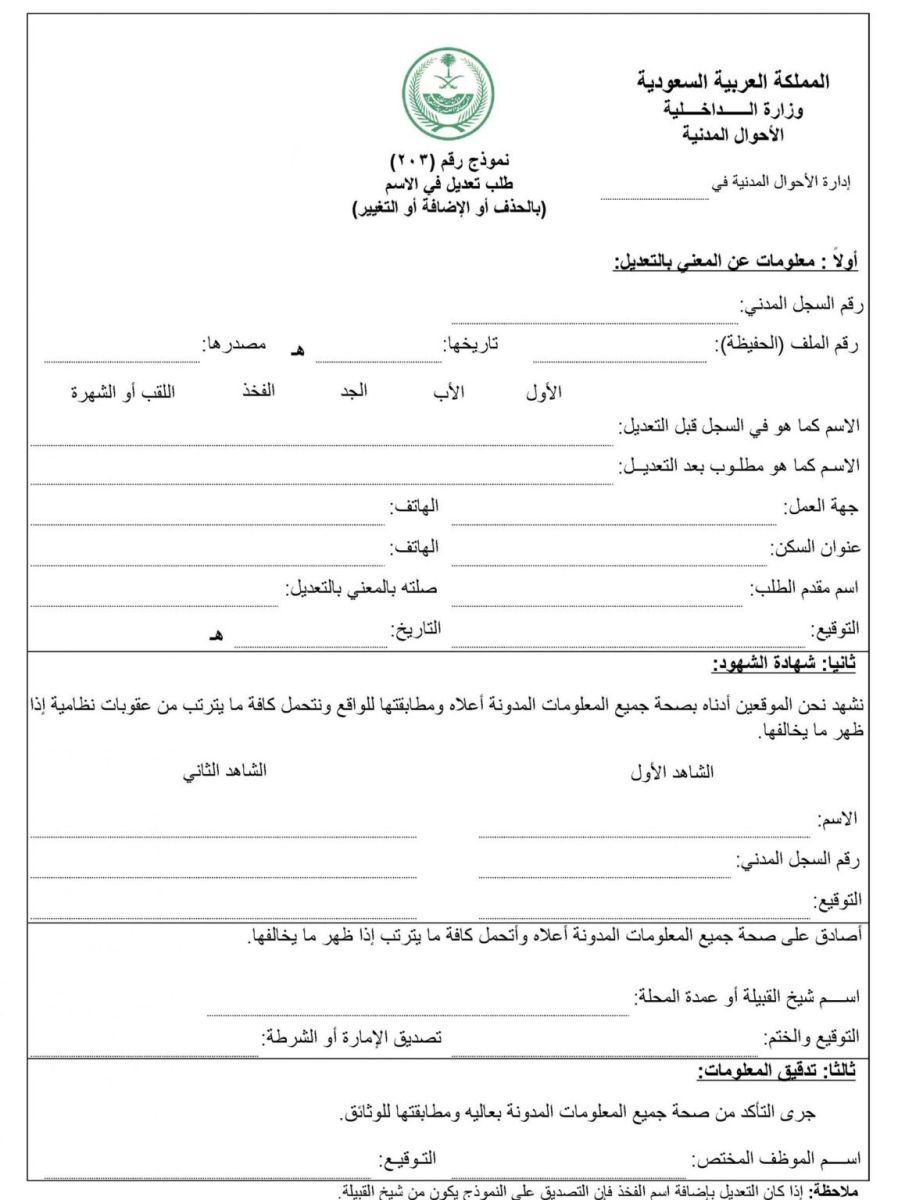 - النموذج الخاص بتغيير الاسم في الاحوال المدنية (نموذج رقم 203) ويمكن الحصول عليه عبر موقع وكالة وزارة الداخلية للأحوال المدنية.