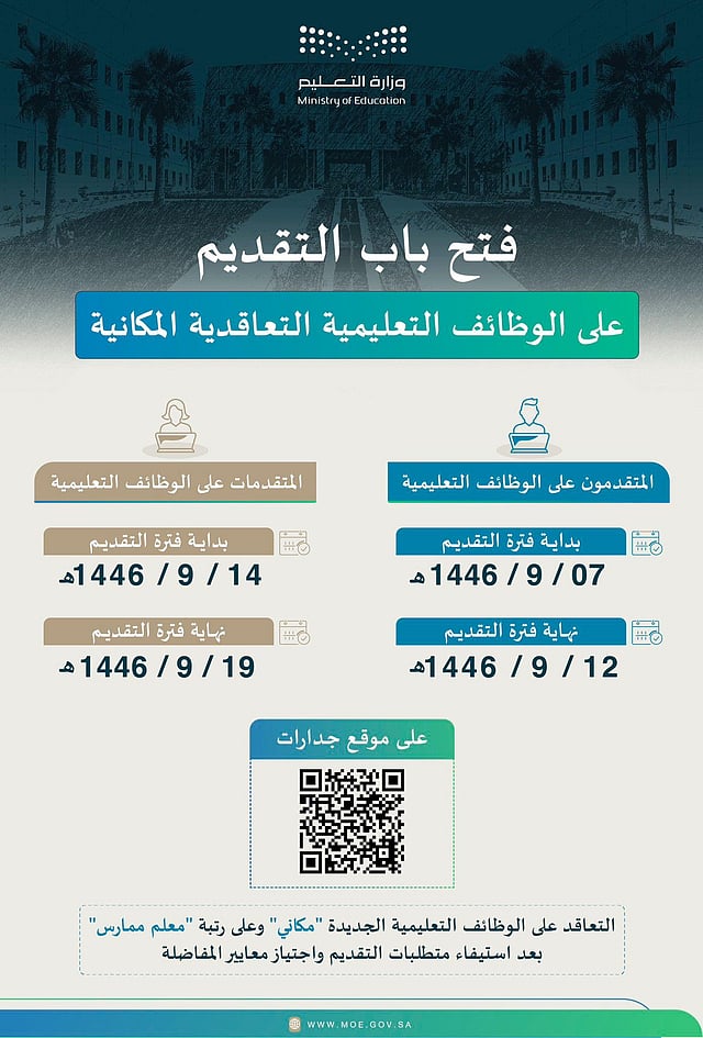 أعلنت وزارة التعليم عن فتح باب التقديم لـ 10,494 وظيفة تعليمية بنظام التعاقد المكاني في جميع إدارات التعليم، وذلك للعام الدراسي 1447هـ . يمكن لجميع الخريجين التقديم عبر المنصة الوطنية الموحدة للتوظيف "جدارات"، وفق تخصصات محددة تهدف لسد احتياجات المدارس.