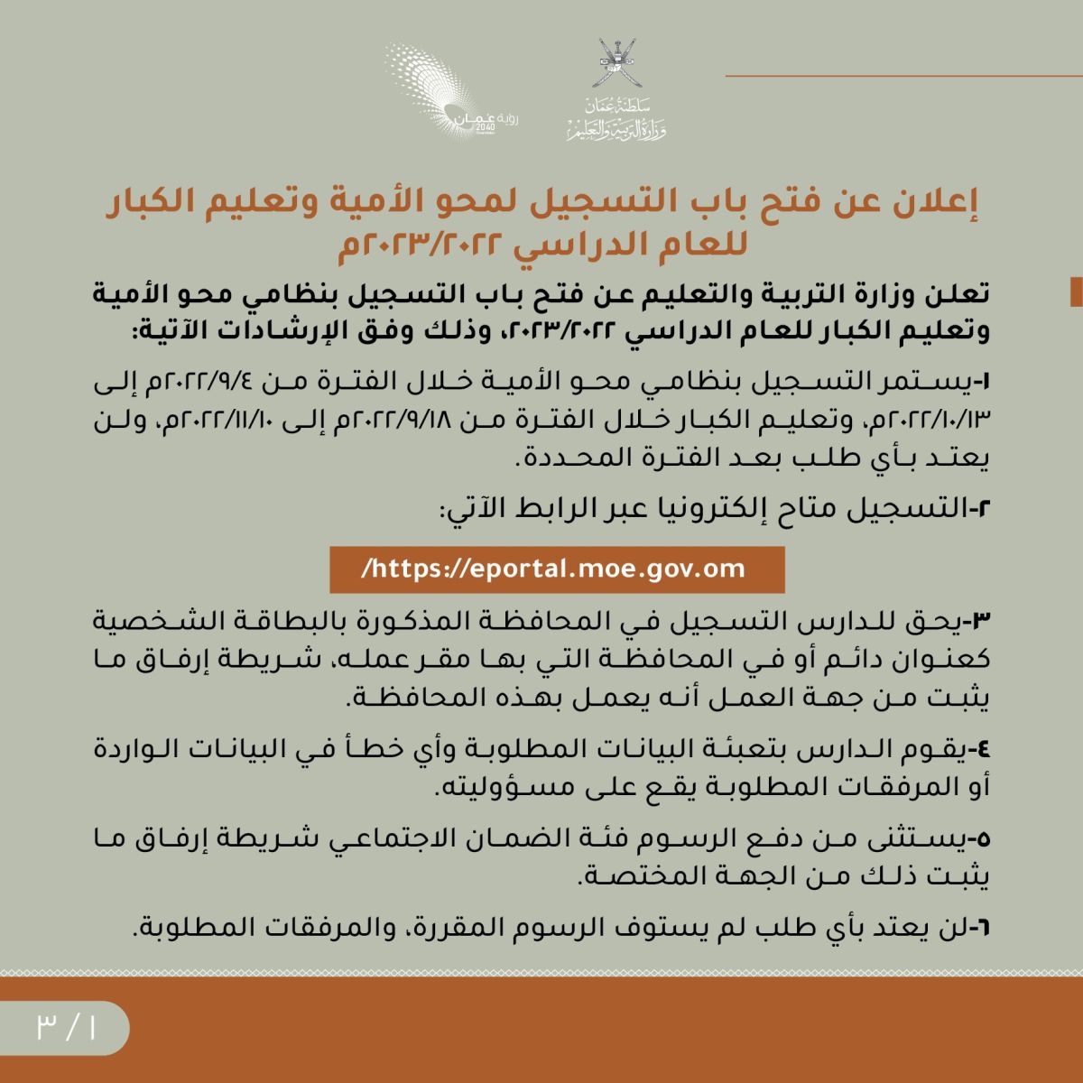وزارة التربية والتعليم في سلطنة عمان اعلنت عن فتح باب التسجيل بنظام تعليم الكبار للصفوف (7 – 12) وذلك من خلال طريق موقع البوابة التعليمية، كما وضحت دائرة خدمات المراجعين بوزارة التربية والتعليم عن مواعيد التسجيل للعام 2022م – 2023م، ولن يقبل بأي طلب بعد انتهاء فترة التسجيل المحدَّدة، حيث يتعيَّن على الذين يرغبون بالتسجيل بنظام تعليم الكبار الالتزام بتعليمات وإرشادات التسجيل ودفع الرسوم المقرَّرة لأجل إتمام عملية التسجيل بنجاح تمسقو بناء على ما تم الاعلان عنه رسميا من الجهات المختصة .