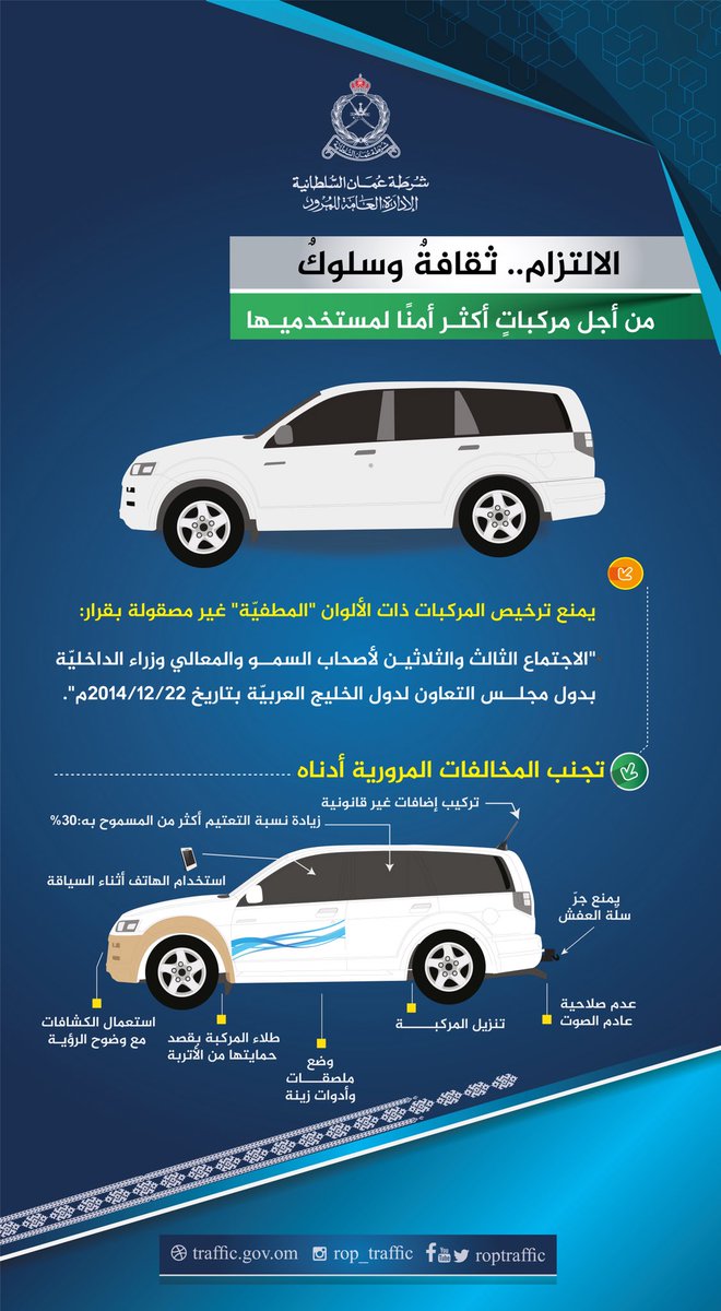 شرطة عمان السلطانيّة تتولى مراقبة كل الأمور المتعلقة بحركة السير والمخالفات التي يرتكبها سائقوا السيّارات عبر الإدارة العامّة للمرور، حيث أنّها تقوم بتسجيل المخالفات لأجل إلزام السائقين بالعقوبات المقرّرة في قانون المرور، وذلك كي يحافظوا على الأرواح والممتلكات وضمان التزام السائقين بمستويات القيادة الآمنة على الطريق قدنرظ بناء على ما تم الاعلان عنه رسميا من الجهات المختصة .